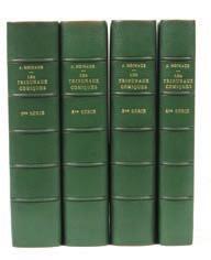 Les tribunaux comiques. Chevalier-Marescq éditeur Paris 1882 à 1889. E.O. sur beau papier. Illustrations de STOP. Première à la quatrième série. 4 volumes reliés plein maroquin vert émeraude, contre-plats à encadrement, têtes dorées, couvertures conservées, chemises et étuis de même cuir, dos des chemises passé (reliures signées Faki) -