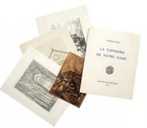 La tapisserie de Notre-Dame. Société des Bibliophiles de Saint-Eloi Paris 1981. L’un des 115 ex sur Arches, seul tirage. Bien complet de la suite des 11 gravures de DECERIS, l’un sur papier d’Auvergne et l’autre sur Montval. Exemplaire complété d’un dessin de DECARIS, une gravure dédicacée et de deux cuivres ayant servis à l’illustration de ce livre, ainsi que de deux lettres manuscrites de DECARIS. En feuilles in-8 sous chemise étui -