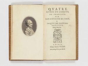 ÉDITION ORIGINALE de ces « Secondes Amours » de Jean-Antoine de Baïf (1532-1589), contenant 287 pièces, essentiellement des sonnets en alexandrins, d’inspiration surtout italienne. Elle est dédiée à Jacques de Cottier. Exemplaire parfaitement relié par l’atelier Belz-Niedrée, actif à Paris entre 1860 et 1880. Ainsi établi, il est emblématique de la redécouverte de la poésie de la Renaissance par les bibliophiles du XIXe siècle, mouvement initié par des personnalités telles que Charles Nodier et Sainte-Beuve. Un portrait de l’auteur a été ajouté au moment de la reliure. Dimensions : 161 x 95 mm. Provenances : Saint-Geniès, qui fut titulaire du 24e fauteuil des Bibliophiles françois, avec son ex-libris ; Librairie Morgand (Cat., 1893, n° 3026). Tchemerzine, I, pp. 243-244 ; Barbier, Ma Bibliothèque poétique, III, Ceux de la Pléiade, pp. 305-313, n° 55 (pour un exemplaire relié par Chambolle-Duru, hauteur : 167 mm) ; Fléty, pp. 21 et 135-136.