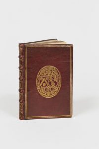 de filets dorés autour des plats, armes au centre, dos à nerfs orné d’un chiffre entrelacé [IAM] plusieurs fois répété, tranches dorées (reliure de l’époque).