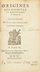 FAUCHET (Cl.). Origines des dignitez et magistrats de France… – Origines des chevaliers, armoiries et héraux. Paris, J. Perier, 1606, 2 ouvrages en un vol. in-8°, vélin rigide, dos lisse, tranches lisses, traces de liens (reliure de l’époque).