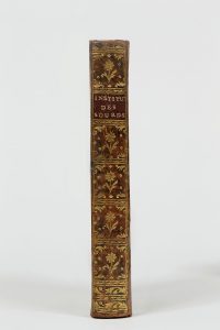 ÉDITION ORIGINALE de l’ouvrage majeur de l’abbé de L’Épée. Il avait fait paraître en 1774 chez Butard un recueil d’exercices intitulé l’Institution des sourds et muets, ou Recueil des exercices soutenus par des sourds et muets pendant les années 1771, 1772, 1773 et 1774 avec des lettres qui ont accompagné les programmes de chacun de ces exercices. L’un des précurseurs de l’enseignement dispensé aux sourds et muets au moyen d’une langue des signes méthodique. Charles-Michel de l’Épée (1712-1789), après des études de droit et de théologie, devient prêtre et fréquente à Troyes l’entourage de Bossuet. Revenu à Paris, il devient précepteur de deux sœurs sourdes, et étudie les gestes avec lesquels elles communiquent ensemble. Disposant d’une fortune personnelle, il transforme alors sa maison en école. Il y reçoit une soixantaine de sourds et muets, et met au point un alphabet à deux mains avec lequel ceux-ci peuvent communiquer. Le roi Louis XVI, à la mort de l’abbé, prit sous sa protection son établissement, que l’Assemblée constituante fondera définitivement à Paris sous le nom d’Institution nationale des sourds-muets. Premier entendant connu à s’être intéressé aux modes de communication des sourds et muets, l’abbé de L’Épée mit au point une langue des signes méthodique utilisable par eux. Son erreur, qui fut de vouloir calquer cette langue sur la structure syntaxique du français parlé, sera corrigée par ses disciples, qui créeront et perfectionneront la Langue des signes françaises (LSF), langue à part entière pratiquée aujourd’hui par plusieurs centaines de milliers de sourds francophones. Petit écrasement à la partie supérieure du premier plat et menues restaurations. Dimensions : 166 x 97 mm. Aucune marque de provenance. Barbier, II, 1882, col. 927 ; Garrison et Morton, 3358 ; Hoefer, XXX, 1859, col. 826-829 ; Imbault-Huart (M.-J.), « L’Épée », in En français dans le texte, BNF, 1990, pp. 180-181, n° 168.