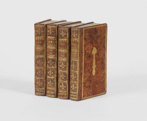 Édition donnée par Cazin. Un portrait de Rabelais gravé par Nicolas de Launay d’après Sarabat en frontispice. Exemplaire d’Antoine Polier de Bottens (1741-1795), relié à sa marque dorée révolutionnaire. Protestant né à Lausanne, Polier de Bottens voyagea aux Indes entre 1772 et 1783. Il y fut le conseiller et l’architecte d’un vizir. À son retour en Europe, il constitua une importante collection de tableaux et de manuscrits. Venu s’installer en France à la Révolution, il fut assassiné peu de temps après par des voleurs. Les ouvrages de sa bibliothèque, dont un grand nombre étaient consacrés aux idées politiques, sont habillés de reliures frappées d’un fer emblématique « au bonnet phrygien coiffant un glaive en pal », dont la poignée est discrètement ornée de son initiale. Sur le contre-plat des trois premiers volumes : étiquette du libraire Louis Luquiens, à Lausanne. Reliures anciennement restaurées. Dimensions : 117 x 63 mm. Provenance : Antoine Polier de Bottens, avec son timbre humide « Antoine Polier an:2: », qui a été découpé au feuillet de titre du tome premier. Cohen, col. 843 (pour un exemplaire à la date de 1783) ; Fontaine (J.-P.), Cazin, l’éponyme galvaudé, L’Hexaèdre, 2012, p. 207 ; Brimo (A.), Les Reliures de la Révolution française, Sun, 1988, p. 27, fig. 13, et p. 63, fig. 56 (reliures présentant le même fer d’Antoine Polier).