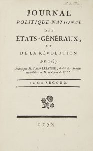 Première édition en volume des 2 premiers abonnements (respectivement 23 et 24 numéros) de ce journal fondé « par l’abbé Sabatier de Castres et rédigé à peu près exclusivement par Antoine Rivarol ». Plusieurs émissions parurent à la même date, dont une avec le nom de l’auteur. Chaque numéro avait précédemment fait l’objet d’une parution séparée. Les 2 premiers numéros avaient été mis en vente les 12 et 14 juillet 1789. Un troisième abonnement comportant 8 numéros parut en 1790, pour lequel Maurice Tourneux ne décrit aucune édition en volume. Le Journal politique-national sera réédité, en 1824, sous le titre Mémoires, chez Baudouin. « Le Tacite de la Révolution ». Écrivain et journaliste, Antoine Rivarol (1753-1801) fut l’une de ces personnalités qui illustrèrent de leurs conversations étincelantes les salons parisiens à la veille et dans les premiers temps de la Révolution. Barbey d’Aurevilly écrit à son sujet : « Par la sveltesse et le vif de son esprit, par cette succession d’éclairs dont il était la source, par l’armature aiguisée de ses facultés qui ressemblaient à des javelots et à des flèches, Rivarol était un journaliste-né. » Son Journal politique-national constitue une véritable histoire des premiers mois de la Révolution racontée au jour le jour. Barbey poursuit : « Sous la plume de [ce “volcan intellectuel”], le journalisme est monté à la hauteur de l’Histoire. » L’engagement de Rivarol en faveur de la monarchie l’obligea, dès 1790, à quitter Paris, puis la France, et à s’exiler d’abord à Bruxelles, puis à Londres et à Hambourg. Précieux exemplaire offert par l’auteur à M. de Théis, avec cet envoi au premier tome : Je voudrais offrir à M. de Theis [sic] une édition plus soignée ; mais ce sont là les chefs-d’œuvre des Presses de Noyon. Je lui présenterai au premier jour la collection du 2e abbonnement [sic]. /. Marie-Alexandre de Théis (1738-1796) fut procureur du roi à Chauny, dans l’Aisne. Il est le père de Constance de Théis (1767-1845), princesse de Salm, femme de lettres qui tint un salon important à Paris dans le premier tiers du XIXe siècle. L’exemplaire est enrichi : 1. d’une L.A. avec l’adresse du destinataire, M. de Théis, « à l’Aventure [à Autreville, dans l’Aisne] », inscrite au verso, contrecollée sur la garde supérieure du premier volume, par laquelle Rivarol accompagna l’envoi de ce volume : « On ne saurait trop louer les paresseux [Rivarol a la réputation d’avoir été un dilettante]. Mais M. de Théis veut absolument leur mettre le feu sous le ventre. Ce Journal n’est qu’une ébauche. Scriptoris membra disjecti [fragments d’écrits dispersés]. » Après quoi, il lui annonce l’envoi de la « collection brochée » des numéros du deuxième abonnement « pour demain ou après ». 2. au tome II, de nombreuses corrections manuscrites autographes, apportées à l’encre, en caractères scriptes, dans le texte et dans les marges du second volume (pp. 18, 28, 29, 31, 43, 45, 57, 65, 78, 79, 87, 94, 95, 128, 139, 147, 161, 162, 164, et aux pages mal chiffrées suivantes, 127, 192, 195, 201, 205, 207, 216, 227, 237, 246, 247, 251 et 267). Il s’agit quelquefois de corrections typographiques ou orthographiques, mais le plus souvent ces corrections apportent au texte des compléments plus ou moins développés. Une note ancienne, dont la photocopie est jointe à l’ouvrage, précise que ces corrections n’ont pas été reprises dans l’édition des Mémoires de 1824 et sont alors inédites. Exemplaire conservé tel que paru. Il est préservé dans une chemise-étui à dos transparent. Le feuillet O2, du second volume, est dérelié. Mouillures aux premiers feuillets du second volume. Dimensions : 209 x 129 mm. Provenance : Marie-Alexandre de Théis, avec la mention manuscrite de son nom au titre du second tome (pas de catalogue à la BNF). Barbier, II, col. 1038 ; Tchemerzine, V, p. 407 ; Tourneux, II, pp. 514-515 et n° 10243 (pour l’une des émissions à la même date) ; Murray (W.), « Rivarol », in Dictionnaire des journalistes, 1600-1789, II, Oxford, Voltaire Foundation, 1999, pp. 855-856 ; Millot (J.), Livres et journaux anciens…, 18 mars 1958, n° 198 (pour l’édition de 1798, parue sous le titre : Tableau historique et politique…) ; Barbey d’Aurevilly (J.), « Rivarol », in Les Critiques, ou Les Juges jugés, Frinzine, 1885, pp. 245-272.
