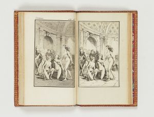 ÉDITION ORIGINALE de ce recueil réunissant dix contes qui, ainsi que le précise le titre, sont « un peu plus que gaillards [et dédiés] aux jeunes gens des deux sexes qui se destinent aux Théâtres ». Elle est rarissime. L’ouvrage sera réédité en 1867, à Bruxelles, sous le titre Les Coutumes théâtrales, avec des reproductions photographiques des gravures de l’édition originale. Cette édition sera condamnée, l’année suivante, par le tribunal correctionnel de Lille, pour outrage à la morale publique et aux bonnes mœurs. Un frontispice et 9 figures, non signées, gravées sur cuivre. 8 des figures sont libres, plusieurs représentent des scènes en costumes. « Seul exemplaire connu aujourd’hui en main privée. » (Gérard Nordmann). Il est enrichi : 1.  d’un état avant la lettre pour 5 des figures libres, 2.  d’un état antérieur pour les 2 autres figures libres, qui ont été réemmargées. Dimensions : 129 x 89 mm. Provenance : Gérard Nordmann (Cat. II, 14-15 déc. 2006, n° 146). Barbier, I, col. 812 (sous le titre de Coutumes… Attribué à Carrey) ; Gay – Lemonnyer, I, col. 740 (« 10 fig. grav. par Carrey ou Carrée ») ; Dutel, I, A-238 ; Pia, Enfer, I, col. 265.