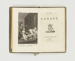 […]. CANAPÉ (Le). À Cythère [Paris], 1797, in-16, maroquin aubergine, jeu de filets dorés autour des plats, dos à nerfs orné d’un fer « au masque de faune » plusieurs fois répété, roulette dorée intérieure, tranches dorées...