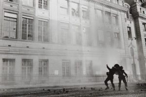 Claude Dityvon (1937-2008)Paris, mai 1968.Deux CRS face à la Sorbonne.Épreuve argentique d’époque. Tampon de l’agence Viva et du photographe au verso.17,8 x 23,8 cm avec marges