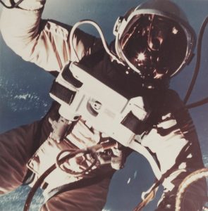 NASA - James McDivitt Gemini IV, 3 juin 1965.Edward White lors de la première sortie extravéhiculaire américaine. Épreuve argentique d’époque sur papier Kodak. Tampon «McDonnell Aircraft Corporation», date et numéro d’archive au...