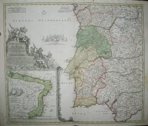 CARTE du Portugal & BRESIL - "Portugalliae et Algarbia cum finitimis Hispaniae Regnis: Castiliae, Legionis, Andalusiae, Extrematurae, Galliciae & Granatae Novissima Tabula", par Jean-Baptiste HOMANNO. c.1710. Carte gravée, sur papier vergé. Coloris...