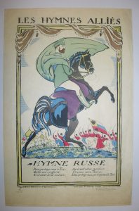 "HYMNE RUSSE". POCHOIR de Robert BONFILS (Tirée à 1000 exemplaires), sur papier Japon. Edité par Le Nouvel Essor, 40 rue des Saints Pères, à Paris. Epreuve numérotée 18/1000 et signée au crayon par l'artiste. Marges. (50 x 32) - Etat A -