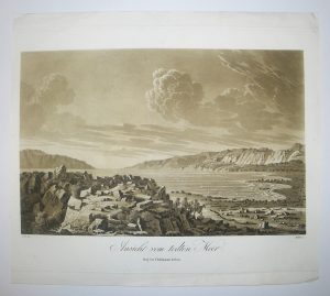ISRAËL - JORDANIE - (VUE de la MER MORTE) - "Ansicht vom todten Meer". c.1827. Aquatinte par G. DÖBLER (1788-1845), imprimée en sépia sur papier vélin. Publiée chez P. Bohmanns, à PRAGUE. Marges du cuivre à gauche et à droite, et marges pour...