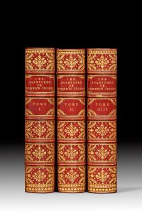 Def^e (Daniel). La Vie et les avantures [sic] surprenantes de Robinson Crusoe. Amsterdam, L'Honoré & Chatelain, 1720- 1721. 4 tomes en 3 volumes in-12, maroquin rouge, triple filet doré, dos orné, dentelle intérieure, tranches dorées (F....