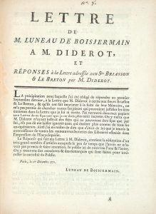 la première intervention publique de Diderot dans le procès intenté contre l'Encyclopédie par Luneau de Boisjermain. J'avoue qu'il est affligeant, Messieurs, dit Diderot, après quarante à cinquante ans d'une probité reconnue dans son commerce, & récompensée par des fonctions distinguées dans son Corps & dans la Société, de se voir tout-à-coup accusé de malversation & de mauvaise foi ; j'avoue qu'il est triste, après une vingtaine d'années de persécution que j'ai bien partagée, d'être troublé dans la jouissance d'une fortune que vous avez méritée par votre travail ; mais une autre position plus fâcheuse encore que la vôtre, ce seroit d'avoir perdu son honneur & gardé son édition ; & cela n'est pas sans exemple (p. 74). Le texte occupe les pages 68-74 du Mémoire pour les Libraires associés à l'Encyclopédie. Contre le sieur Luneau de Boisjermain et fait suite à deux autres textes : Mémoire pour les Libraires associés à l'Encyclopédie (pp. 1- 37) et Mémoire à consulter, pour les Libraires associés à l'Encyclopédie (pp. 38-67) EXEMPLAIRE DONNÉ PAR DIDEROT AU LIBRAIRE LE BRETON, UN DES IMPRIMEURS DE L'ENCYCLOPÉDIE. Il porte sur la couverture la mention manuscrite M. Le Breton, des notes manuscrites de Pierre Jean-Baptiste Gerbier, l'avocat de Diderot et des libraires de l'Encyclopédie, un croquis ( ?) sur la couverture et de nombreux soulignés. L'exemplaire provient des archives du libraire André François Le Breton.