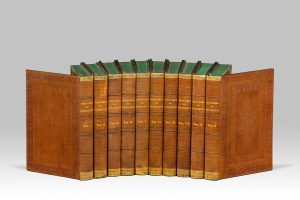 par des filets et une roulette de rinceaux, grand cartouche central de forme losangée avec quadrilobe imbriqué, dos lisse orné de roulettes dorées en tête et queue, filets et caissons à froid, tranches vertes (Reliure de l'époque). Édition originale des mémoires de Louis-Antoine Fauvelet de Bourrienne (1769-1834), diplomate, secrétaire d'État de Napoléon, ministre plénipotentiaire à Hambourg puis préfet de la police de Paris en 1815. TRÈS BEL EXEMPLAIRE DANS UNE SÉDUISANTE RELIURE ROMANTIQUE ÉTRANGÈRE. Ex-libris armorié gravé de Bloomfield. Légères rousseurs. Infime manque à une coiffe.