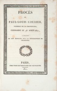 siècle). EXCEPTIONNEL RECUEIL CONSTITUÉ AU XIX SIÈCLE ET RÉUNISSANT 18 RARES PAMPHLETS DE PAUL-LOUIS COURIER, PRESQUE TOUS EN ÉDITION ORIGINALE .Il se compose de la manière suivante : Pétition aux deux chambres. [181 6]. — Lettre à Messieurs de l'Académie des inscriptions et belles-lettres. [1819]. — Procès de Pierre Clavier-Blondeau, pour prétendus outrages faits à M. le maire de Véretz, département d'Indre et Loire. [1819]. — Lettres au rédacteur du Censeur, par P.-L. Courier, cultivateur. Paris, Aimé Comte, 1820. — À Messieurs du Conseil de préfecture de Tours. [1820]. — Lettre particulière. [1820]. — Seconde lettre particulière. Paris, Chez les Marchands de nouveautés, 1820. — Simple discours de Paul Louis, vigneron de la Chavonnière, aux membres du Conseil de la commune de Veretz, département d'Indre-et-Loire, à l'occasion d'une souscription proposée par son excellence le ministre de l'Intérieur, pour l'acquisition de Chambord. Paris, Chez les Marchands de nouveautés, de l'Imprimerie de A. Bobée, 1821. — Aux Âmes dévotes de la paroisse de Veretz, département d'Indre-et-Loire. [1 821]. — Procès de Paul- Louis Courier, vigneron de la Chavonnière, condamné le 28 août 1821, à l'occasion de son Discours sur la souscription de Chambord. Paris, Chez tous les Marchands de nouveautés, 1821. — Collection de lettres et articles publiés jusqu'à ce jour dans différents journaux. Paris, L'Huillier, avril 1824. — Pétition pour des villageois que l'on empêche de danser. Par Paul-Louis Courier, vigneron, ancien canonnier à cheval, sorti l'an passé des prisons de Sainte-Pélagie. Paris, Chez les Marchands de nouveautés, 1 822. — Réponse aux anonymes qui ont écrit des lettres à Paul-Louis Courier, vigneron. Bruxelles, Demat, 1822. — Réponse à des anonymes, qui ont écrit des lettres à Paul-Louis Courier, vigneron. N°2. Huitième édition. Bruxelles, Demat, 1823. — Livret de Paul-Louis Courier vigneron, pendant son séjour à Paris, en mars 1823. N°3. Cinquième édition. S.l.n.d. — Gazette du village, par Paul-Louis Courier, vigneron. N°4. Bruxelles, Demat, 1823. — Pièce diplomatique, extraite des journaux anglais. On l'a dit envoyée de Cadix à M. Canning, par un des agents secrets, qui l'aurait eue d'un valet de chambre, qui l'aurait trouvée dans les poches de Sa Majesté Catholique. N°5. Bruxelles, Demat, 1823. — Pamphlet des pamphlets. Paris, Chez les Marchands de nouveautés, 1824. Les première et seconde Réponse aux anonymes avaient chacune été précédées d'un rarissime tirage lithographique clandestin. Le pamphlétaire Paul-Louis Courier (17721825) est resté célèbre pour sa traduction de Daphnis et Chloé (1810), ainsi que pour l'incident de la tache d'encre sur le manuscrit de l'œuvre de Longus à la bibliothèque Laurentienne de Florence. Ses pamphlets, tirés pour certains à petit nombre, sont très difficiles à réunir. La présente collection est presque parfaite : outre le Placet des ministres (1819) et Un vieux soldat de l'armée (1823), réimprimés ici à la suite du Procès de Pierre Clavier-Blondeau et du Livret, il ne manque que la pièce À Messieurs les juges du Tribunal civil de Tours (1818) pour qu'elle soit complète. On a relié en tête du volume : Notice biographique sur la vie de Paul-Louis Courier de Méré, vigneron, ancien canonnier à cheval. Extrait de la biographie française publiée à Londres, et rédigée à Paris. Paris, Ponthieu, 1824. 24 pages. Édition originale de cette biographie anonyme qui serait l'œuvre du poète et journaliste Henri de Latouche (1785-1851), ami de Courier et proche de Stendhal. Table manuscrite à la plume sur la première garde, avec légère décharge sur le titre de la première pièce du recueil. Légères rousseurs.