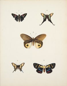 BEL ALBUM, comprenant un titre à la plume orné d'une bordure feuillagée et aquarellée, 13 DESSINS ORIGINAUX TRÈS FINEMENT GOUACHÉES PAR LÉON CAPTOT et 67 planches gravées et coloriées. Les planches sont généralement accompagnées d'une légende manuscrite. LES 13 DESSINS ORIGINAUX COMPORTENT 7 PLANCHES DE PAPILLONS ET DE CHENILLES, 4 DE COLÉOPTÈRES ET 2 DE VÉGÉTAUX. L'album s'ouvre par des papillons exotiques, originaires des Indes orientales, de l'île de Java, du Brésil, d'Amérique centrale ou de Nouvelle-Hollande. Les papillons d'Europe sont représentés par 3 dessins de chenilles. Puis viennent les coléoptères, dont les 4 planches présentent au total 24 espèces différentes, appartenant aux genres Silpha, Necrophorus, Lamia, Cicindela, Callidium, Leptura et Cerambix. Quant aux 2 planches de botanique, elles montrent des feuilles de Sagittaria sagittifolia, Hedra helix, Ribes rubrum et Anemone nemorosa. Les 67 planches gravées en taille-douce et coloriées sont de format in-4 ; 39 d'entre elles sont issues de l'Entomologie du naturaliste Guillaume Antoine Olivier (Paris, 1789-1808). Ces dernières, dessinées par Lebrecht Reinold et gravées par Swebach, Desfontaines, Juillet, Copia, représentent des coléoptères et sont accompagnées d'une légende manuscrite en regard des sujets. Les 28 autres planches sont extraites de divers ouvrages, français ou étrangers, et montrent des papillons (14 pl.), coléoptères (7 pl. provenant de l'atlas zoologique du voyage de la Coquille), oiseaux (1 pl., extraite du même livre), insectes (3 pl.), botanique (1 pl.), coquillages (1 pl. avant la lettre) et mammifères (1 pl.). Outre ces 67 planches, on trouve plusieurs planches supplémentaires de plus petit format ainsi que de nombreuses notes autographes de Léon de Captot. L'auteur de ce recueil, Léon de Captot, naquit dans l'Eure en 1818 et mourut dans son château normand du Camp- Hérout, à Bosc-Bénard-Commin, en 1 899. L'album a probablement été composé en vue d'une publication et quelques notes ajoutées ultérieurement montrent qu'il a été continué jusqu'au début des années 1 880, mais resta inachevé. Ensemble bien conservé, quasiment sans rousseurs.