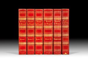 d'après les Manuscrits de la Bibliothèque du Roi et de la Bibliothèque de l'Arsenal ; par P. Chabaille. Paris, Silvestre, 1835. Un volume. Ensemble 5 volumes grand in-8, demi-maroquin rouge à long grain avec coins, dos orné de filets dorés, non rogné (Purgold). Édition illustrée de 4 frontispices dessinés par Desenne et gravés en taille-douce par Ashby. Le Supplément est orné d'une planche en fac-similé. EXEMPLAIRE SUR GRAND PAPIER VERGÉ, COMPRENANT UN SECOND ETAT DES FIGURES ALEAU-FORTE PURE, revêtu d'une élégante reliure de Purgold. Quelques piqûres sur les figures. On joint, dans une reliure très proche : ROTHE (A.). Les Romans du Renard examinés, analysés et comparés, d'après les textes manuscrits les plus anciens. Paris, J. Techener, 1845. Grand in-8, relié de même en demi-maroquin rouge avec coins (Petit Succ r ^ Édition originale. Exemplaire en grand papier de Hollande. Des bibliothèques Am. Berton et Georges Dubois, avec leur ex-libris respectifs (ne figurent pas au catalogue des ces ventes).