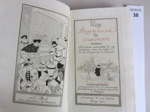 CASANOVA Jacques. Une aventure de Casanova . Histoire complète de ses amours avec la belle CC et la religieuse de Muran. Paris chez l'artiste. 1926 , 2 volumes in-12 étroit. Couvertures illustrées, chemise et étui. Edition ornée de 33 eaux...