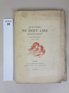 Ce que vierge ne doit lire , plaisirs d'amour , ornée de vignettes et fleurons. Edition Dentu 1879 , in-12. À toutes marges non rognées, couverture souple salie ornée d'une petit vignette.Un des 25 sur Hollande , tirage non précisé.
