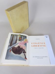 COLETTE. L'ingénue libertine. 1947. Edition du grand chêne , dédicace anonyme. Bon état. N°714/1000. Frontispice de Suzanne Balivet. Petite suite de 6 gravures en couleur non prévues dans le justificatif de tirage. Chemise et boite.