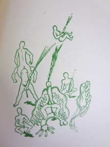 SATYREMONT (pseudonyme de Benjamin Perret) . Les rouilles encagées. Éric Losfeld , tiré à 2103 exemplaires non numéroté. 1954. In-12 Illustrations en vert de Tanguy. Dos décollé. Rare. Pages se décollant, haut du dos légèrement coupé