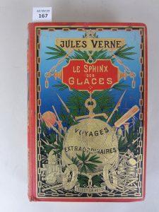 VERNE Jules, Le sphinx des glaces, voyages extraordinaires. Paris, Edition Hetzel. 68 illustrations par George Roux , 3 tranches dorés, reliure polychrome à la mappemonde , dos lisse , déchirure sur un mors du premier plat, tache et choc sur le...