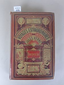 VERNE Jules. Nord contre Sud. Edition Hetzel. Cartonnage polychrome aux deux éléphants , dos lisse , 3 tranches dorées poussiéreuses , coiffe frottée , nombreuses rousseurs , 85 dessins de Bennett et une carte , ensemble en bon état ,...