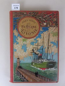 VERNE Jules. Un drame en Livonie .Edition Hetzel. Reliure au steamer , coins émoussés , dos lisse , 33 illustrations de L.Bennet , reliure un peu lache , 3 tranches dorées , reliure en percaline.
