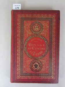 VERNE Jules. Voyage au centre de la Terre. Hetzel , in-8 , intérieur frais. Très bon état. Vignettes de Riou. Reliure de Magnier en très bon état , couverture rouge rigide ornée de fleurons, petites taches sur le quatrième plat , dos lisse...