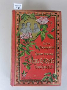 FLAMMARION Berthe. Histoire très vraie de trois enfants courageux. Paris, Flammarion. In-8. Bon état. Illustré par Montader. Très nombreuses rousseurs, reliure en percaline rouge signé Engel, couverture illustrée , dos lisse doré , 3 tranches...