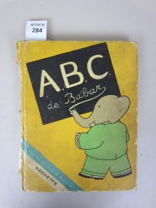 ABC de Babar. Edition hachette. 1949. Petit in-8. Edition originale. Dessins de Jean de Brunhoff couverture cartonnée salie, dos abimé, intérieur très frais, juste une petite tache de rouille dans les marges.