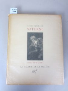 MALRAUX André.Essai sur Goya , Saturne. 1950. Les galeries de la pléiade. Taches brunes sur l'ensemble des pages, nombreuses illustrations.