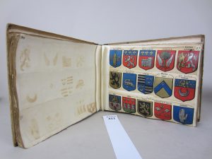 Armorial national des villes de France , un album amicorum. In-8 oblong. Ensemble des blasons des villes de France découpés et collés sur papier verger, classés par départements, début 20eme , ensemble des blasons en couleur.