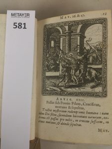 INSTITUTIONS CHRISTIANES. Anvers, édition Plantin. 1589. In-12. Belle reliure postérieure en veau , petits motifs sur les plats. Dos lisse orné. L'ouvrage contient 95 gravures sur 100 , il manque dix pages.