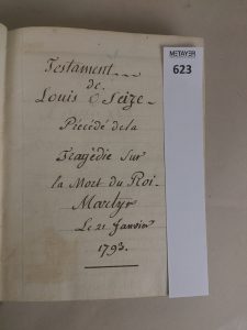TESTAMENT DE LOUIS XVI, précédé de la tagédie sur la mort du roi. Deux manuscrits sur papier verger , 1er manuscrit 201 pages dont 4 blanches ,1793. 2eme manuscrit 211 pages 1814. Demi reliure marron , plat vert. Événements survenus pendant la...