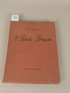 ELUARD Paul. À Pablo Picasso , éditions des trois collines, édition originale 1944. Bon état. Les mors sont un peu usés, couverture orange poussiéreuse.