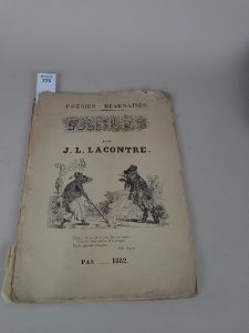 LACONTRE. Poésies Béarnaises, Pau 1882, Brochure , fables en béarnais et traduction en regard avec une règle sur la prononciation de la langue béarnaise , une gravure en page de titres, 4 gravures in texte , 8 pages de poésies béarnaises et...