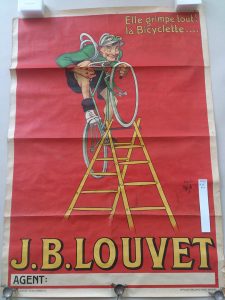 ELLE GRIMPE TOUT LA BICYCLETTE. JB LOUVET d'après Mich Affiche représentant un homme à bicyclette grimpant sur une échelle. Beau format