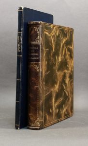 1750 ; plaquette in-8 de 37 p., cartonnage bradel papier bleu nuit, titre doré en long au dos, non rogné, [Rel. de la fin du xviiie s.], légèrement frotté. Rare plaquette en faveur de Marie Lajon et contre Pierre Berlhe, homme cynique qui la séduisit, l’enleva, l’engrossa et la séquestra, avant de « mettre son corps dans l’esclavage. » C’est aussi un plaidoyer contre l’esclavage et pour la liberté des femmes. Exemplaire bien complet de la rare figure du cadenas qui manque presque toujours et enrichi de 3 figures gravées sur cuivre, dont une de Moreau gravée par Simonet, d’une aquarelle originale et de deux figures lithographiées (?) aquarellées. Gay, Iii, 753. Brunet, Ii, 1393. Quérard, Iii, 215.— Joint : • Caufeynon (pseud. de Jean Fauconney). La Ceinture de chasteté. Son histoire, son emploi, autrefois et aujourd’hui. Paris, Société parisienne d’éditions, 1904 ; in-12 carré, basane olive marbrée, dos long à coiffes débordantes orné de motifs dorés, pièce de titre bordeaux, tête dorée, non rogné, [Richardot]. Édition originale de ce curieux ouvrage, orné de 28 planches, dont 12 reproductions photographiques. Bon exemplaire, bien relié, enrichi de deux cartes postales anciennes
