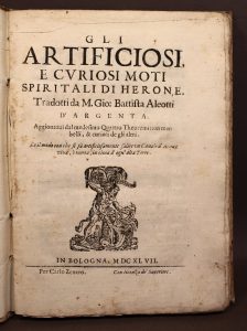 [Héron D’alexandrie]. Gli artificiosi e curiosi moti spiritali di Herone. Bologna, Carlo Zenero, 1647 ; pet. in-4, cartonnage d’attente papier crème fort, titre manuscrit au dos, non rogné, [Rel. du xviiie s.]. Orné de 81 figures gravées sur