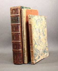 Joints : • Basan (F.). Dictionnaire des graveurs anciens et modernes, depuis l’origine de la gravure. Seconde édition. Paris, chez l’auteur, Cuchet, Prault, 1789 ; 2 tomes en un vol. in-8, demi-veau marbré, dos à nerfs orné, non rogné, [Rel. de l’époque], un peu frottée, coiffes absentes. L’ouvrage était parfois accompagné de gravures. Quelques notes au crayon. Ex-libris héraldique Philip Stanhope. • Larcanger (Charles). Concordance des poids décimaux avec le poids de marc. […] Cet ouvrage est utile et même indispensable aux orfèvres, jouailliers, Bijoutiers, Marchands d’or et d’Argent, et généralement à tous ceux qui vendent au poids de marc. Paris, chez l’auteur, Cartier et Compagnie, an 11 - 1802 ; pet. in-8, demi-parchemin. Légères rousseurs. Un feuillet manuscrit a été ajouté anciennement