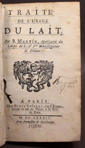 Martin (Barthelémy). Traité de l'usage du lait. Paris, Denys Thiery, 1684 ; in-12, demi-parchemin, dos à nerfs muet, [Rel. postérieure]. Édition originale de cet ouvrage introuvable. « Curieux traité divisé en Xii chapitres ; il yest question du