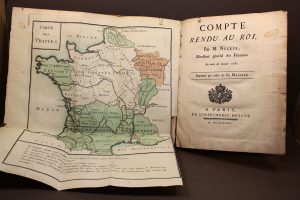 Necker (Jacques). Compte rendu au Roi. Au mois de janvier 1781. Paris, Imprimerie royale, 1781 ; in-4, cartonnage demi-parchemin à coins, dos muet, [Rel. de l'époque], frotté.. Deux cartes de France gravées sur cuivre, aquarellées et repliées et