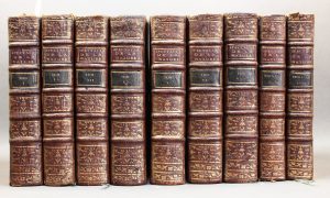 en 9 vol. in-12, veau marbré, dos à nerfs orné de motifs dorés, pièce de titre rouge et de tomaison verte, tranches marbrées, [Rel. de l’époque], très légers frottements. Orné de 9 frontispices et 202 figures h. t., dont 162 repliées, le tout gravé sur cuivre par Le Bas d’après Robert, Boucher, Eisen, etc. Très belles figures de zoologie, de botanique, de jardins, d’instruments, d’astronomie, etc. Bon exemplaire, bien complet de toutes ses planches, malgré d’infimes rousseurs