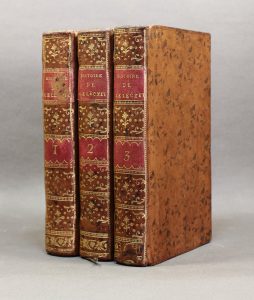 Priestley (Joseph). Histoire de l’électricité, traduite de l’Anglois […] avec des notes critiques. Paris, Herissant le fils, 1771 ; 3 vol. in-12, basane marbrée, dos long orné de motifs dorés, pièces de titre et de tomaison rouges, [Rel. de