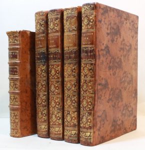 cailloutées, [Rel. de l’époque]. Frontispice de Cochin et 8 (sur 12) figures hors texte de Gravelot, gravés sur cuivre. Bel exemplaire. Cohen, 520.— JOINT, du même : • Les Pensées de J. J. Rousseau, citoyen de Genève. Amsterdam, s. n., 1764 ; in-12, basane marbrée, dos à nerfs, pièces de titre vieux rouge, [Rel. de l’époque]. Relié à la suite : Discours sur l’économie politique. Amsterdam, s. n., 1764.