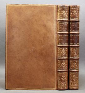 Rey, 1776 ; 2 vol. in-8, veau fauve, encadrement de trois filets dorés sur les plats, dos à nerfs orné de motifs dorés, pièces de titre et de tomaison havane, tranches dorées, [Rel. de l’époque], coins et mors très lég. frottés. Édition originale et unique, de cet ouvrage inspiré des doctrines physiocratiques. « Doctrine plus agrarienne que populationniste, […] : population, société domestique, la propriété et la liberté, les biens et les richesses, le luxe, la subordination dans la société, l’impôt, le commerce, la guerre. Conclusion : les sources de la félicité sont la propriété, la liberté et la sûreté ; « les indices les plus clairs de la félicité d’un pays sont donc une agriculture florissante, une population nombreuse et aisée, la liberté et l’habitude de l’instruction et enfin une paix durable et rarement interrompue » (Ined). Très bon exemplaire, dans une plaisante reliure de l’époque. Barbier, Iii, 1031. Ined, 4116. Einaudi, A.867. A échappé à Kress
