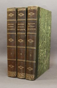 Senebier (Jean). Histoire littéraire de Genève. Genève, Barde, Manget et compagnie, 1786 ; 3 vol. in-8, demi-basane vert Empire, dos à nerfs plats orné de motifs dorés, tranches marbrées, [Rel. de l'époque], dos brunis. Bon exemplaire, malgré ...