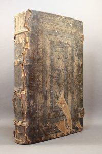 roulettes à froid sur les plats, dos à double nerfs, titre calligraphié en gouttière, traces de fermoirs, [Rel. de l’époque], reliure usagée, manques importants au dos et au second plat. [6] ff. dont titre imprimé en rouge et noir dans un encadrement Renaissance, cclxvii ff., [1] f. de privilège. Le texte de Sénèque est dans un corps plus grand, avec un interlignage double, le vaste commentaire est dans une disposition plus resserrée. Mouillure étroite en fond des premier cahiers ; bord des tous premiers et tous derniers ff. effrangés (humidité), sinon bon exemplaire. Renouard, Bade, Iii, 252, n° 2
