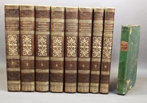 froid, tranches marbrées, [Rel. de l’époque], légers frottements au dos. Figures hors texte gravées sur acier. Le tome 8 est constitué du Dictionnaire topographique des environs de Paris, qui sert de table et de complément à l’Histoire. Légères rousseurs.— Joint : • [Lottin, Louis Neel-Augustin]. Voyage de Paris à St Cloud par mer, et retour de St Cloud à Paris par terre. Paris, Duchesne, 1762, 1760 ; 2 parties en un vol. in-12, demi-parchemin vert, dos long, pièce de titre acajou, [Rel. de l’époque], mors fendus. Carte gravée sur cuivre repliée du trajet. « La seconde partie est augmentée des Annales et Antiquités de Saint-Cloud. Elles couvrent les années 551 à 1752, c’est-à-dire jusqu’à la fête donnée à Saint-Cloud par le duc d’Orléans à l’occasion de la convalescence du dauphin. Suit la description de tous les spectacles donnés à cette occasion, sur l’eau, dans les jardins, jeux, bals, feux d’artifice, etc. » Découpe dans le blanc du titre comblée et découpe au dernier feuillet comblée également, avec le texte remplacé au crayon.